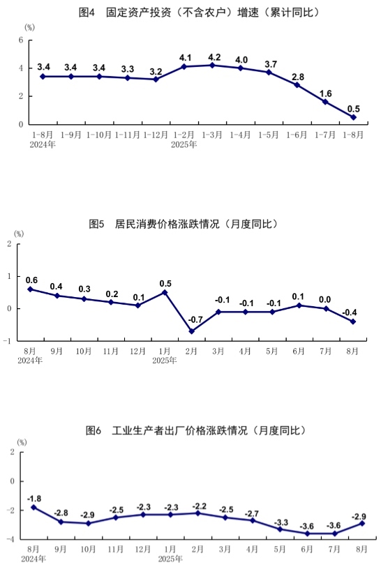 8月份,社會消費品零售總額39668億元,同比增長3.4%;環(huán)比增長0.17%。按經(jīng)營單位所在地分,城鎮(zhèn)消費品零售額34387億元,同比增長3.2%;鄉(xiāng)村消費品零售額5281億元,增長4.6%。按消費類型分,商品零售額35172億元,增長3.6%;餐飲收入4496億元,增長2.1%?;旧铑惡筒糠稚夘惿唐蜂N售增勢良好,限額以上單位日用品類、糧油食品類、體育娛樂用品類商品零售額分別增長7.7%、5.8%、16.9%。消費品以舊換新政策效果繼續(xù)顯現(xiàn),限額以上單位家具類、家用電器和音像器材類、文化辦公用品類、通訊器材類商品零售額分別增長18.6%、14.3%、14.2%、7.3%。1—8月份,社會消費品零售總額323906億元,同比增長4.6%。全國網(wǎng)上零售額99828億元,同比增長9.6%。其中,實物商品網(wǎng)上零售額80964億元,增長6.4%,占社會消費品零售總額的比重為25.0%。1—8月份,服務零售額同比增長5.1%。其中,文體休閑服務類、旅游咨詢租賃服務類、交通出行服務類零售額較快增長。