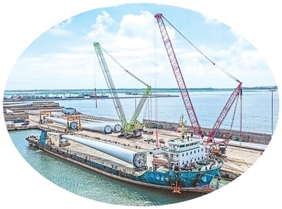 在山東省榮成市石島管理區(qū)的海上風電產(chǎn)業(yè)基地,超大型風電葉片正在吊裝和運輸,準備運往海上作業(yè)區(qū)進行安裝。李信君攝(人民視覺)