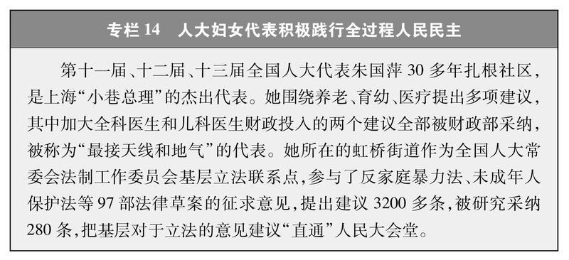通過人民代表大會行使國家權力。人大代表中婦女代表比例不斷提升。2023年第十四屆全國人大婦女代表790人,占26.5%,比第十二屆、十三屆分別提高3.1個、1.6個百分點;全國縣、鄉(xiāng)兩級人大婦女代表比例分別為31.64%、32.36%。人大婦女代表依法履職盡責,聽取和反映婦女群眾和各方意見建議。2018-2025年,全國人大婦女代表提出建議、批評和意見共29328件,占建議總數的42.3%。
