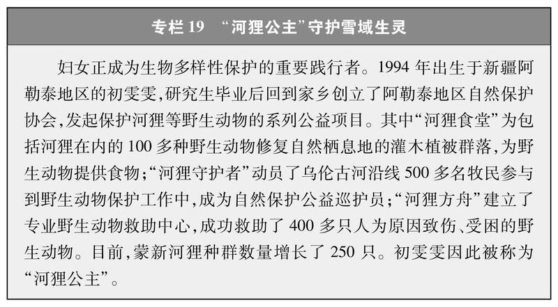 推動生態(tài)系統(tǒng)保護修復。統(tǒng)籌推進山水林田湖草沙一體化保護和系統(tǒng)治理,著力構建從山頂到海洋的保護治理大格局。廣大婦女積極投身生態(tài)系統(tǒng)保護修復,在19.07萬平方公里的三江源國家公園,有1.7萬余名生態(tài)管護員日夜堅守,其中婦女占33.3%;海南昌江黎族自治縣的“植樹娘子軍”,30余年持續(xù)摸索反復試驗,在荒漠中種出了3萬多畝近600萬株海防林;陜西女子民兵治沙連50多年治理了1.4萬畝荒漠地區(qū),使昔日寸草不生、人跡罕至的荒漠變成了“林成網、樹成行”的大漠綠洲;寧夏賀蘭縣“紅馬甲”巾幗志愿服務隊常年開展護河護灘護鳥行動;江蘇南京市持續(xù)開展“長江大保護”巾幗行動。在增綠護林、防沙治沙、江河保護、生物多樣性保護等各方面都展現著婦女的堅韌與智慧。