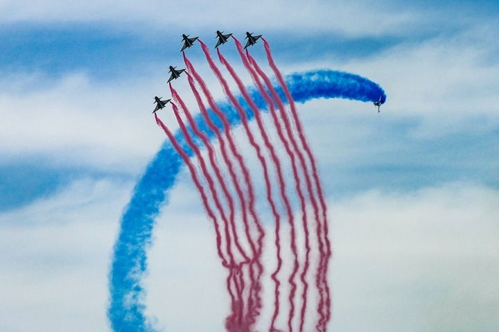 10時(shí)許,空軍航空大學(xué)“紅鷹”飛行表演隊(duì)采取雙四機(jī)超密集編隊(duì)起飛,拉開飛行表演序幕。8架紅白藍(lán)涂裝的教-8飛機(jī)完成機(jī)群集合后,以經(jīng)典的“紅鷹”編隊(duì)動(dòng)作通場,八機(jī)鉆石斤斗、六機(jī)快滾、雙機(jī)點(diǎn)贊、單機(jī)盤旋繞軸、七機(jī)開花等19個(gè)動(dòng)作高水平呈現(xiàn)。