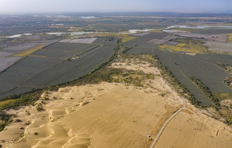 5月22日,在新疆尉犁縣境內(nèi)的塔里木河南岸防沙治沙區(qū),大型機(jī)械在平整沙丘(無(wú)人機(jī)照片)。