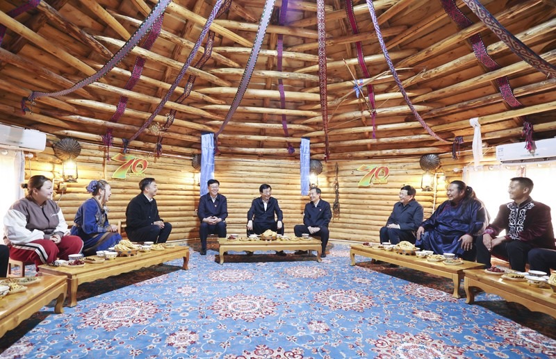 9月27日,受習(xí)近平總書記囑托,中共中央政治局常委、全國政協(xié)主席、中央代表團團長王滬寧帶領(lǐng)中央代表團部分成員到阿勒泰地區(qū)布爾津縣考察。這是王滬寧和中央代表團部分成員在扎拉特鄉(xiāng)村旅游專業(yè)合作社同村民交流。新華社記者 姚大偉 攝
