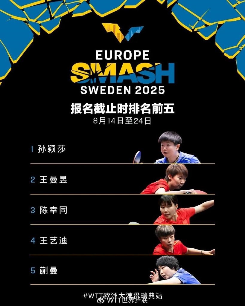 新華社北京7月6日電 世界乒乓球職業(yè)大聯(lián)盟(WTT)歐洲大滿(mǎn)貫賽瑞典站將于8月14日至24日在馬爾默舉行。首批參賽名單6日公布,男、女單打世界排名第一的國(guó)乒隊(duì)員林詩(shī)棟、孫穎莎在列。