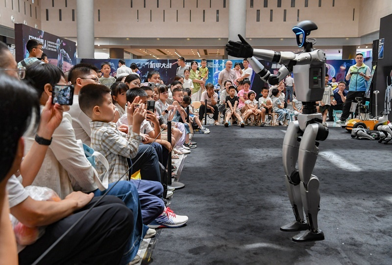 當日,浙江省金華市金華之光文化廣場科技館舉辦AI智能機器人科普展,吸引了許多家長帶著小朋友與人形機器人、智能機器狗、下棋機器人、足球機器人等互動,沉浸式感受人工智能技術的魅力,樂享暑期生活。