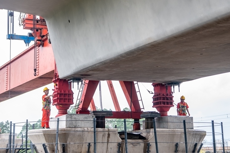 當日,中鐵十四局工人將首孔長24.6米、重542噸的箱梁架設在西渝高鐵重慶段陳家溝特大橋第一孔橋墩上,標志著西渝高鐵重慶段箱梁架設施工正式啟動。
