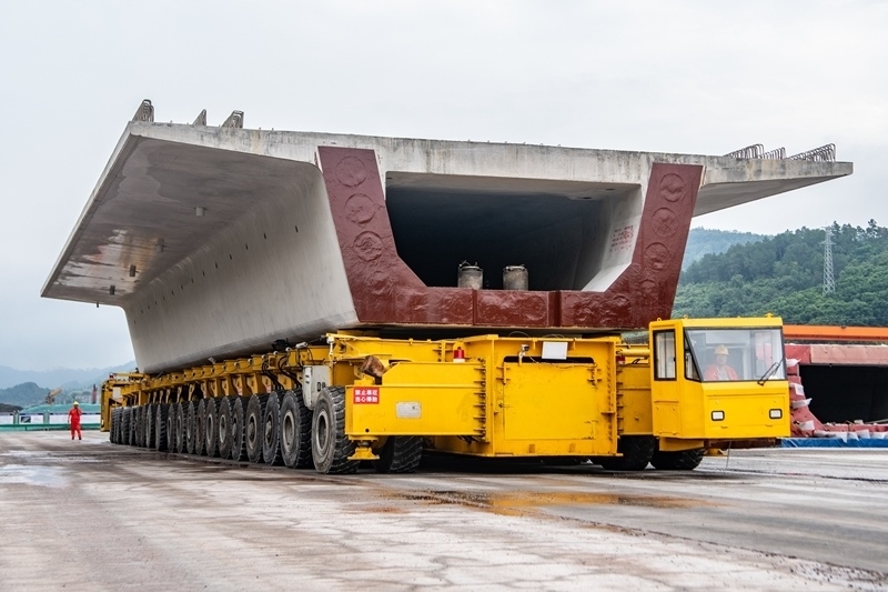 7月10日,在西渝高鐵陳家溝特大橋附近的制梁場,運梁機在進行箱梁轉(zhuǎn)運作業(yè)。