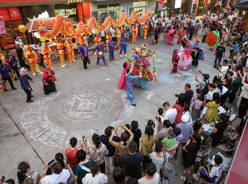7月10日,民間藝人在利川市非遺美食街為游客表演節(jié)目(無人機(jī)照片)。