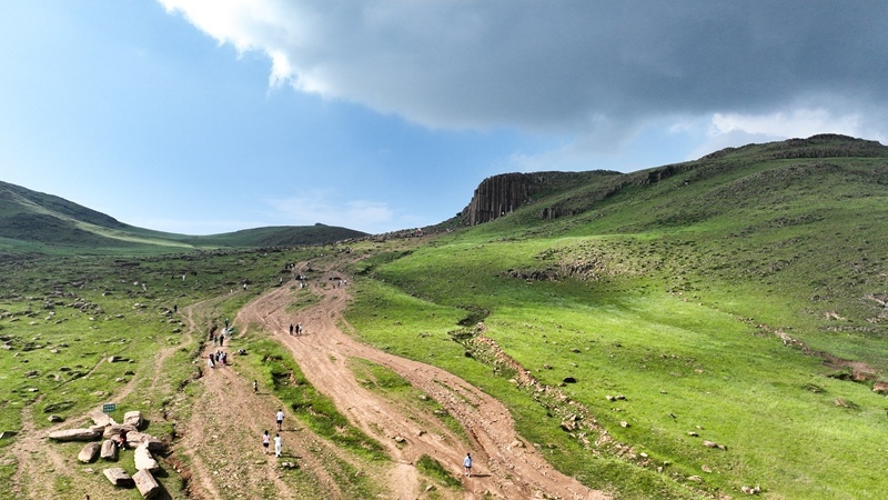 7月11日,游客在內(nèi)蒙古錫林郭勒盟太仆寺旗石條山游玩(無(wú)人機(jī)照片)。