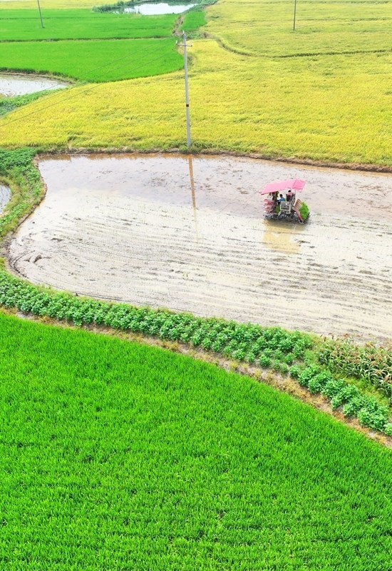 7月13日,湖南省衡陽(yáng)市衡東縣霞流鎮(zhèn)農(nóng)民駕駛農(nóng)機(jī)進(jìn)行晚稻插秧工作(無(wú)人機(jī)照片)。