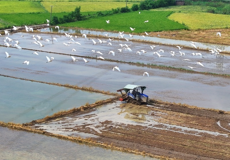 7月13日,湖南省衡陽(yáng)市衡東縣霞流鎮(zhèn)農(nóng)民駕駛農(nóng)機(jī)翻耕稻田(無(wú)人機(jī)照片)。