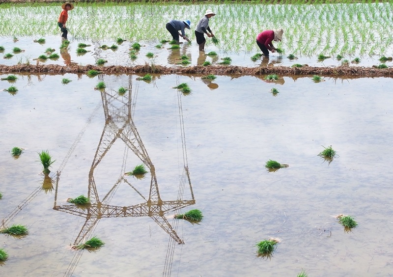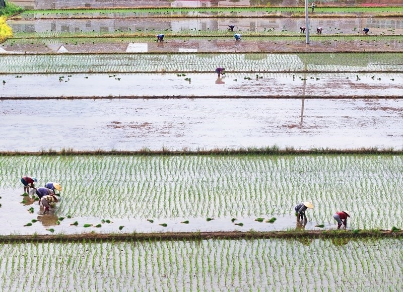 7月13日,湖南省衡陽(yáng)市衡東縣霞流鎮(zhèn)農(nóng)民在搶插晚稻(無(wú)人機(jī)照片)。