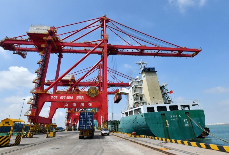 7月16日,一艘輪船靠泊在黃驊港綜合港區(qū)集裝箱碼頭裝貨。