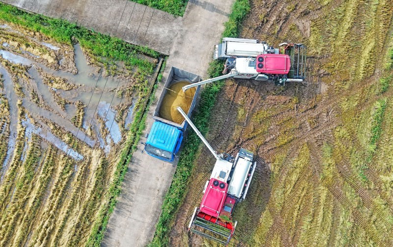 7月15日,在浙江省臺(tái)州市仙居縣下各鎮(zhèn),農(nóng)民將剛收割的稻谷裝車(chē)(無(wú)人機(jī)照片)。