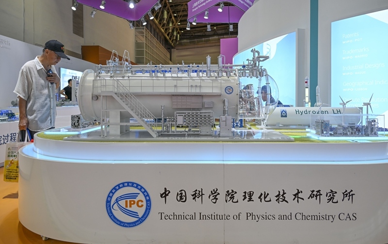 7月17日在先進(jìn)制造鏈展區(qū)創(chuàng)新鏈專區(qū)拍攝的中國(guó)科學(xué)院理化技術(shù)研究所自主研制的國(guó)內(nèi)首套5噸/天氫液化器模型。