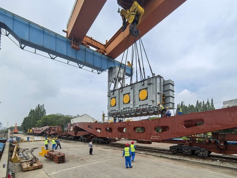 7月19日,特大型變壓器在上海鐵路物流中心閔行站裝車緊固。