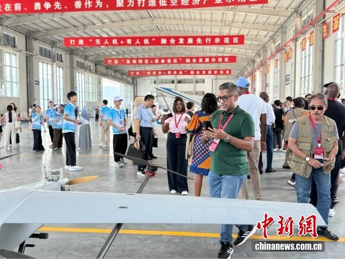 7月16日,在江西省贛州市南康區(qū)低空經(jīng)濟(jì)產(chǎn)業(yè)園,外媒記者參觀無(wú)人機(jī)。中新網(wǎng) 黃方 攝