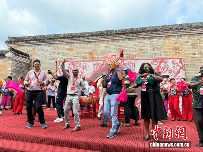 中新網(wǎng)7月21日電(記者 黃方) 鼓聲“咚咚咚”在江西贛州龍南市關(guān)西新圍響起,非洲記者大會(huì)秘書長(zhǎng)威廉·奧洛首次嘗試舞龍。他興奮地?fù)u動(dòng)著龍頭,跟隨節(jié)奏躍動(dòng),忍不住連聲贊嘆:“這太有節(jié)奏感了!”