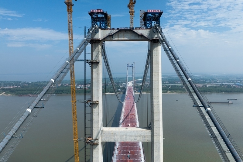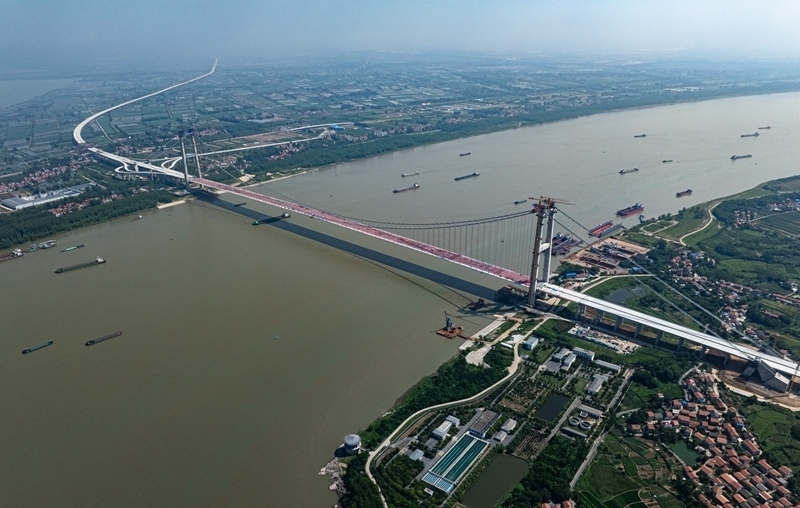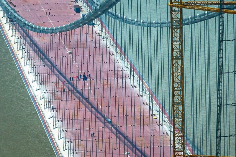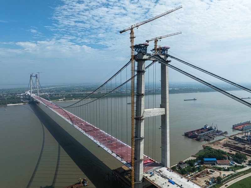 據(jù)了解,新港高速公路武漢雙柳長江大橋及接線工程是國家高速路網(wǎng)武漢都市圈環(huán)線重要組成部分,路線全長35.043公里,其中跨江主橋主跨1430米、寬50.5米,設(shè)計時速120公里,采用雙向8車道設(shè)計,是目前長江上在建的最寬鋼箱梁懸索橋。