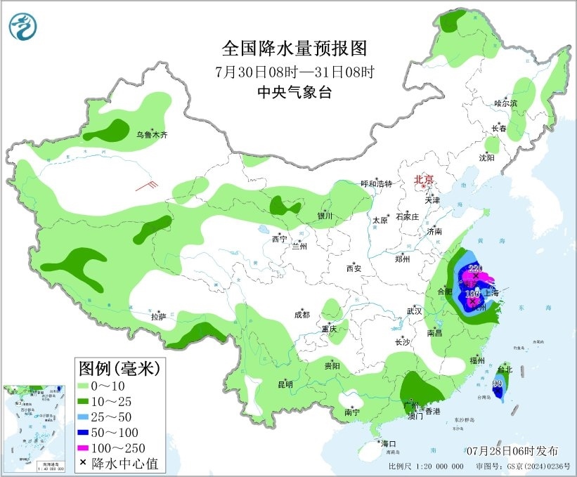 7月29日08時至30日08時,內(nèi)蒙古東北部、黑龍江北部、吉林中部、遼寧北部、江蘇南部、上海、浙江中東部、臺灣島中南部、廣東南部等地的部分地區(qū)有大到暴雨,其中,浙江中東部等地的部分地區(qū)有大暴雨(100~200毫米)。內(nèi)蒙古東部有4~5級風。東海大部海域、臺灣以東洋面偏南海域、巴士海峽將有7~8級、陣風9級的西南風,臺風中心經(jīng)過的附近海域風力可達9~10級、陣風11~12級。
