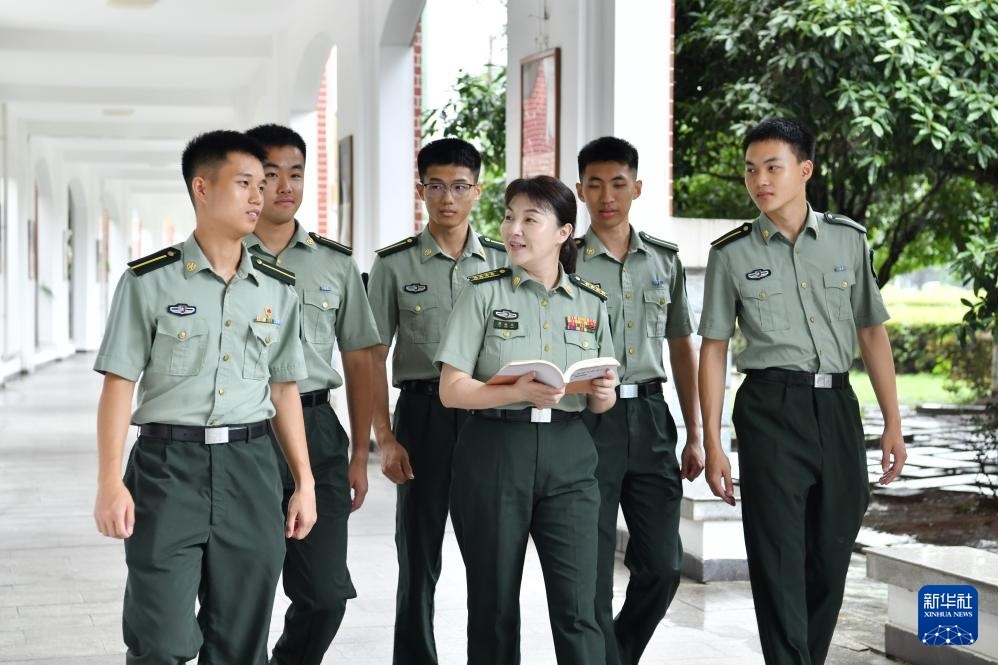 國防科技大學軍政基礎教育學院教授傅婉娟(左三)在課后與學員討論問題(7月22日攝)。新華社發(fā)(王驍 攝)