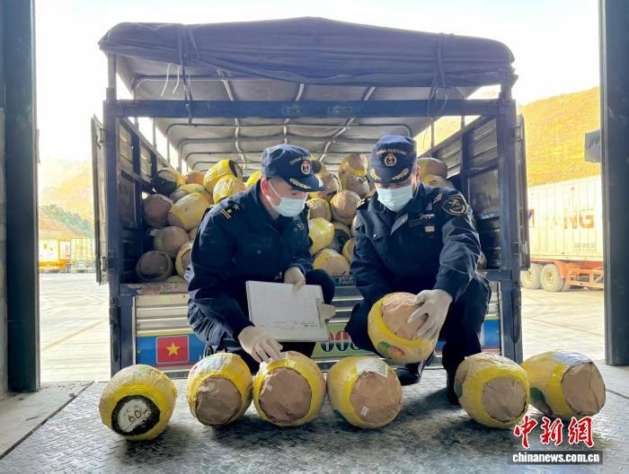 當(dāng)前正值東南亞水果上市季節(jié)。上午8點(diǎn),在天保口岸國(guó)際貨場(chǎng),中越兩國(guó)貨車在橫跨盤龍河的大橋上交錯(cuò)而過。一輛輛滿載越南新鮮荔枝、榴蓮的貨車有序駛?cè)胩毂?诎?,辦結(jié)通關(guān)手續(xù)后,這些水果將啟程運(yùn)往中國(guó)內(nèi)地。