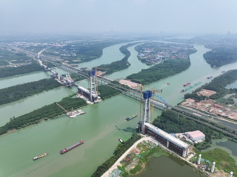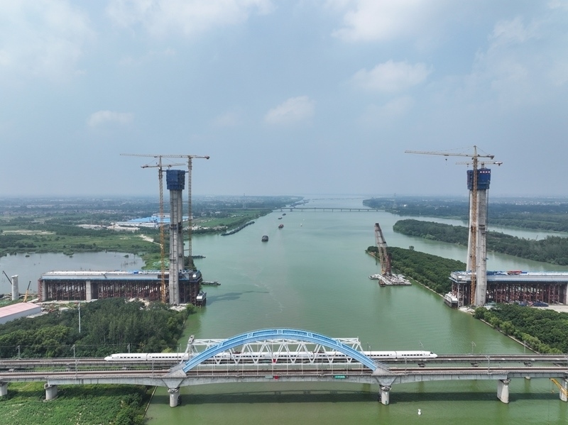 這是8月5日拍攝的滬渝蓉高鐵跨京杭運河斜拉橋建設(shè)現(xiàn)場(無人機照片)。