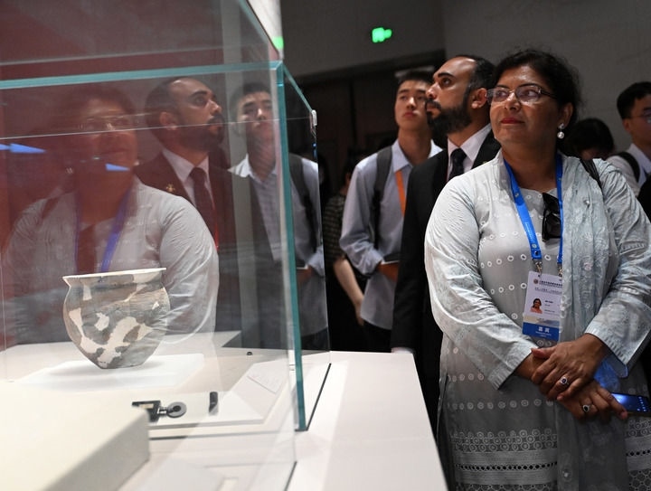 2025年7月24日,上海合作組織媒體智庫峰會子活動“文化遺產(chǎn)保護利用交流合作會”的參會嘉賓在鄭州大河村遺址博物館新館參觀。新華社記者 李嘉南 攝