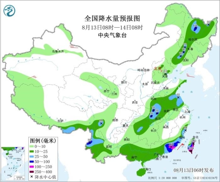 8月13日08時至14日08時,黑龍江中部、吉林西部、遼寧西部、河南南部、湖北中部、江蘇北部、云南西部、廣東東部、福建東部和南部、西藏南部、臺灣島大部等地部分地區(qū)有大到暴雨,其中,福建東南部、廣東東南部、臺灣島東部和南部等地部分地區(qū)有大暴雨,臺灣島東部和南部等地局地特大暴雨(250~390毫米)。臺灣以東洋面有12~13級風,陣風14~15級;臺灣海峽、巴士海峽有10~11級風,陣風12~13級。
