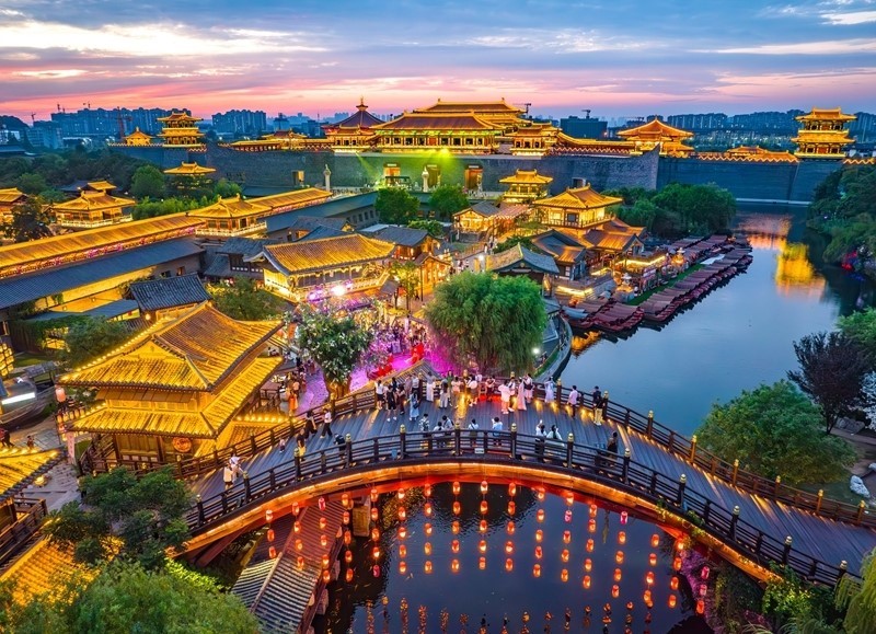 8月11日,湖北省襄陽市唐城景區(qū)夜景璀璨,吸引游客前來游玩(無人機照片)。