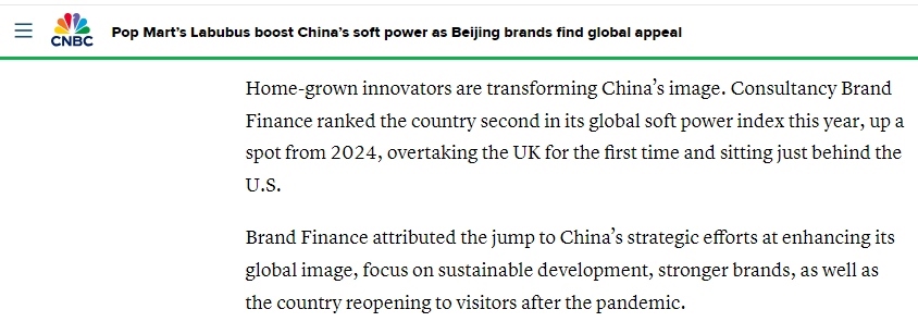 文章說,英國“品牌金融”咨詢公司今年發(fā)布的全球軟實力指數(shù)顯示,中國排名升至全球第二——較2024年上升一位,首次超越英國,目前僅次于美國。該公司分析認為,中國軟實力躍升的重要原因在于中國提升國際形象的戰(zhàn)略性舉措、對可持續(xù)發(fā)展的堅定投入、日益增強的品牌實力,以及向全球游客敞開國門。消費分析師認為,經(jīng)過這些努力,人們終于能穿透貼在中國產(chǎn)品身上的負面濾鏡,看清產(chǎn)品的真正價值,逐漸擺脫過去對“中國制造”的刻板偏見。