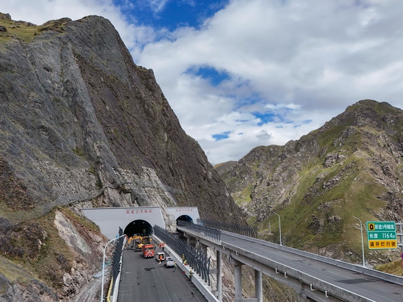 工人在新疆烏尉高速公路躍進(jìn)3號(hào)隧道南端施工(8月19日攝,無(wú)人機(jī)照片)。