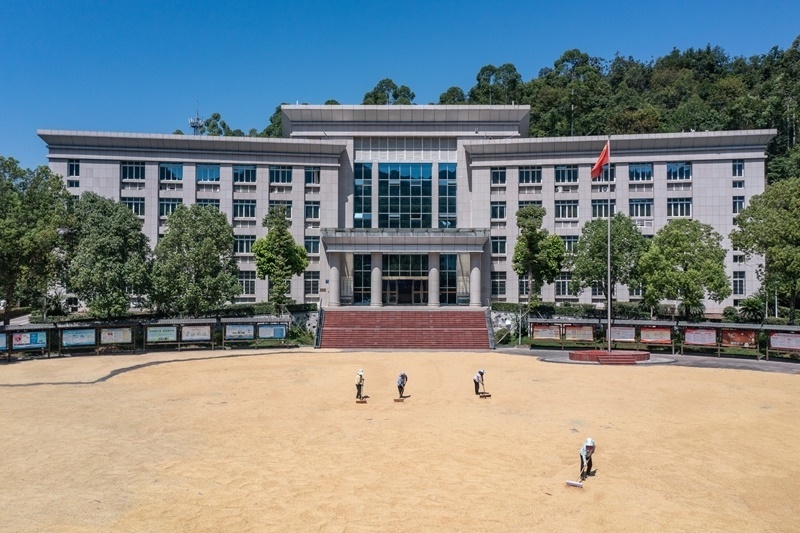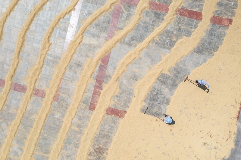 8月20日,人們?cè)谥貞c市永川區(qū)紅爐鎮(zhèn)政府廣場(chǎng)上晾曬糧食(無(wú)人機(jī)照片)。