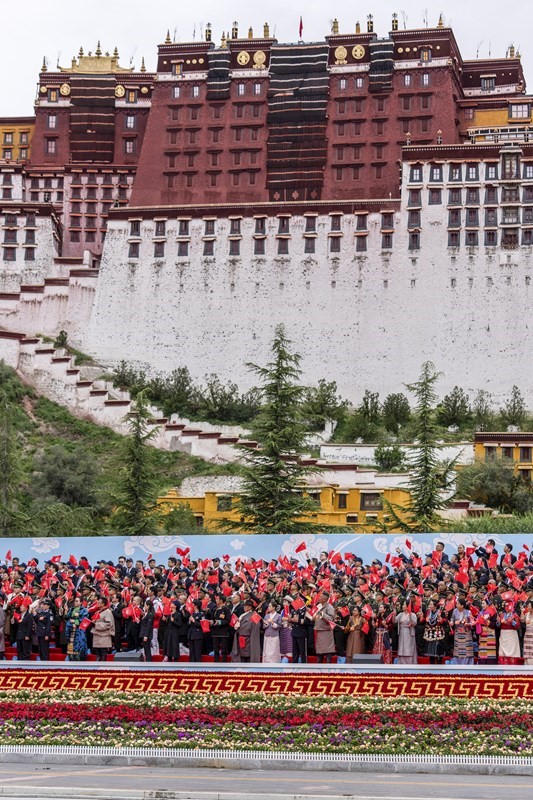 8月21日上午,西藏各族各界干部群眾約2萬人歡聚拉薩市布達(dá)拉宮廣場,熱烈慶祝西藏自治區(qū)成立60周年。這是游行隊(duì)伍通過布達(dá)拉宮廣場。
