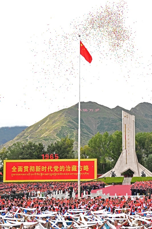 8月21日上午,西藏各族各界干部群眾約2萬人歡聚拉薩市布達(dá)拉宮廣場,熱烈慶祝西藏自治區(qū)成立60周年。這是慶祝大會現(xiàn)場。