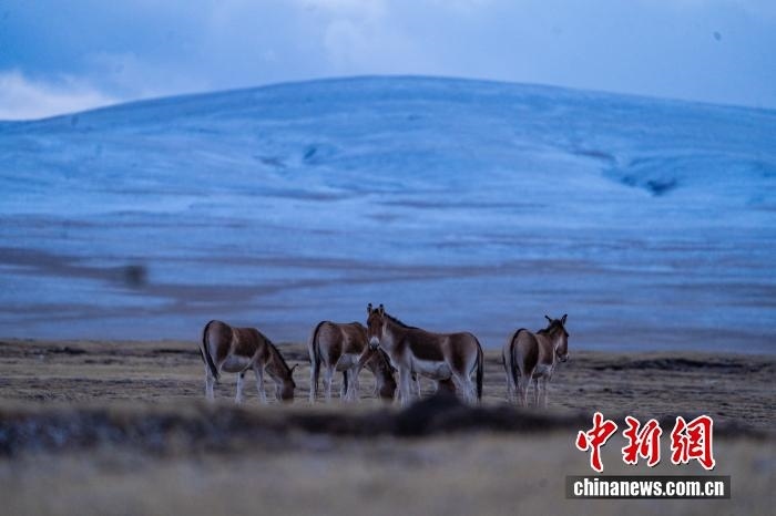 2024年10月23日,中國(guó)國(guó)家一級(jí)保護(hù)動(dòng)物藏野驢在西藏自治區(qū)那曲市安多縣多瑪鄉(xiāng)境內(nèi)的草原上覓食、嬉戲。中新社記者 貢嘎來松 攝