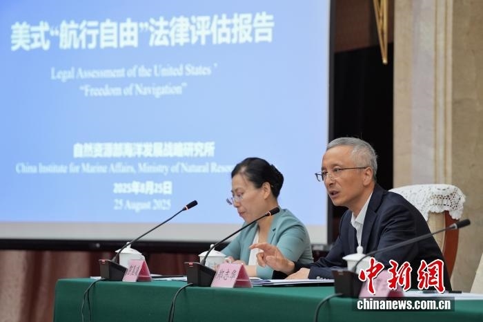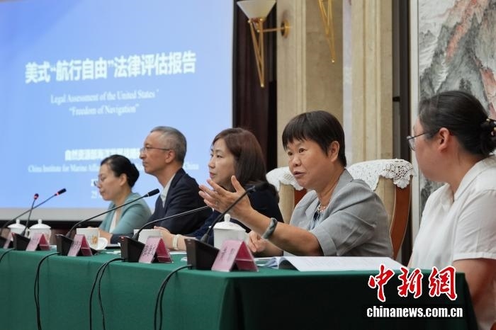 8月25日,中國自然資源部海洋發(fā)展戰(zhàn)略研究所在北京發(fā)布《美式“航行自由”法律評估報(bào)告》中英文版。該《報(bào)告》旨在對美國“航行自由”相關(guān)主張和實(shí)踐是否符合國際條約和一般國際法、是否具備法律基礎(chǔ)進(jìn)行評估。圖為自然資源部海洋發(fā)展戰(zhàn)略研究所前所長張海文(右二)答記者問。中新社記者 張祥毅 攝
