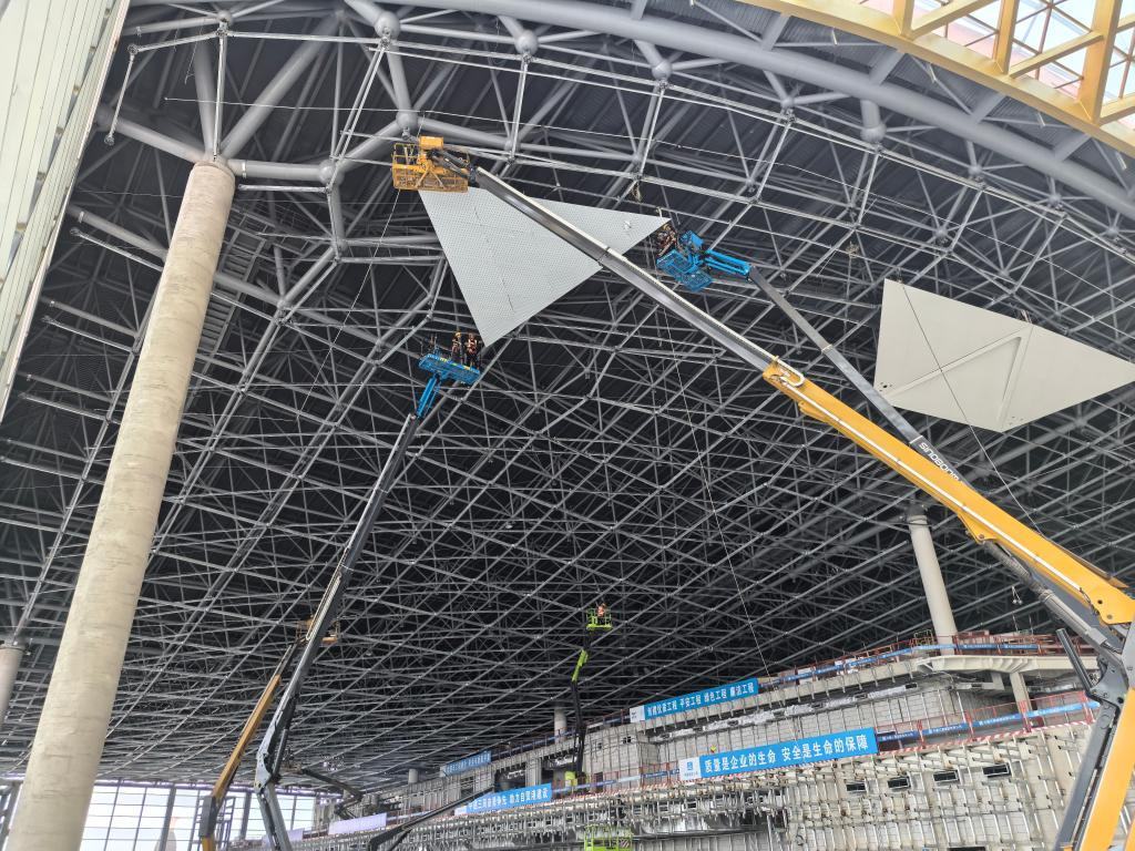 工人正在對T3航站樓進(jìn)行室內(nèi)裝飾裝修。(中建三局供圖)