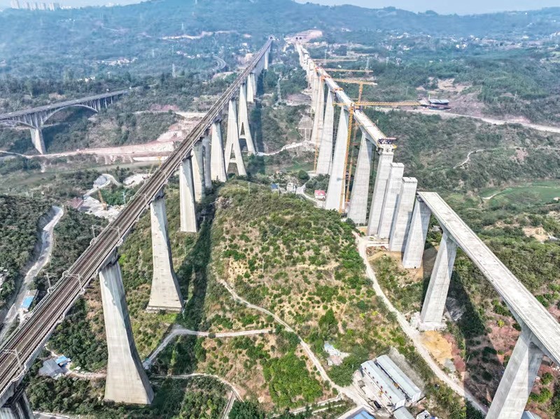 蔡家溝雙線(xiàn)特大橋位于重慶市涪陵區(qū),橫跨長(zhǎng)江支流,是全線(xiàn)重難點(diǎn)工程。大橋主跨采用連續(xù)剛構(gòu)設(shè)計(jì),整體呈“兩端短、中間長(zhǎng)”的對(duì)稱(chēng)結(jié)構(gòu),總跨度達(dá)584米。
