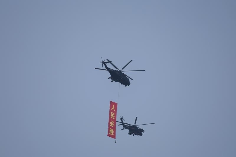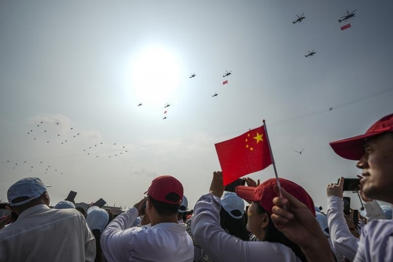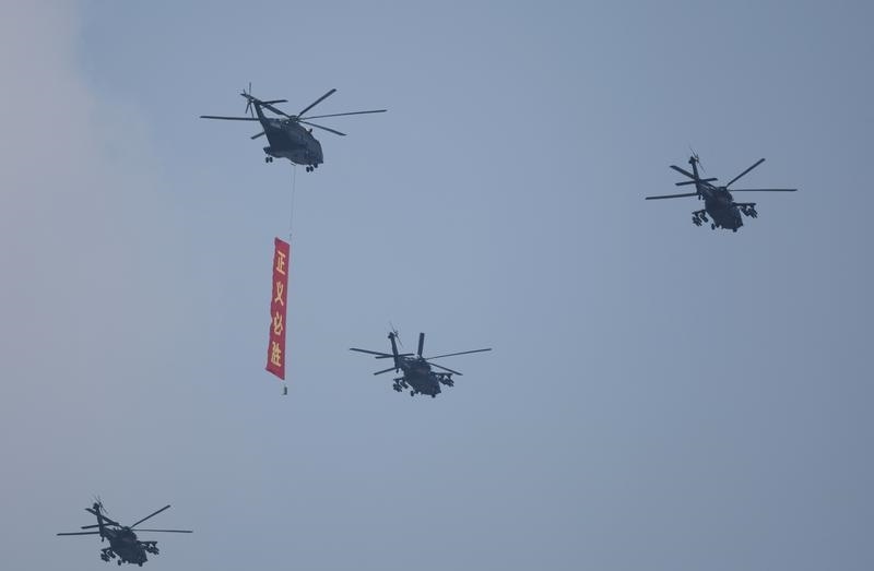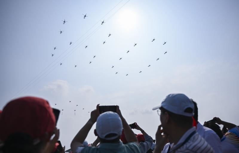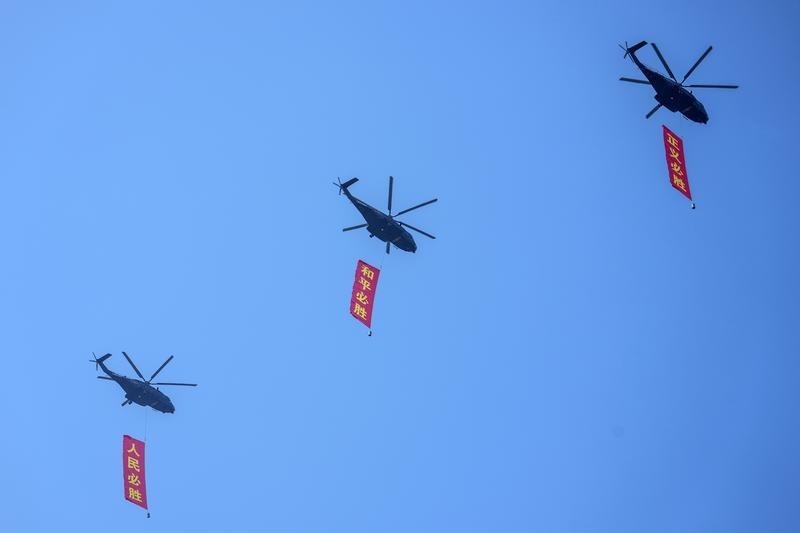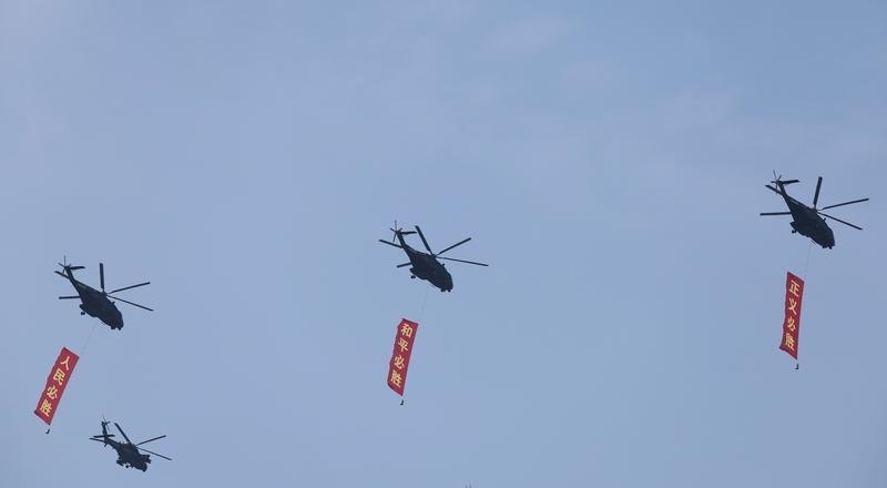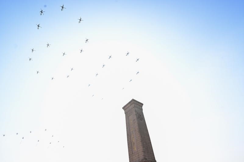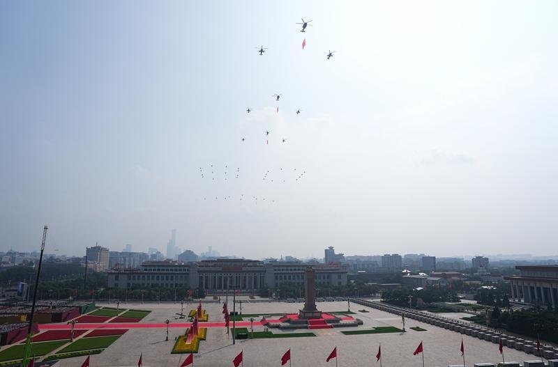 9月3日,紀(jì)念中國人民抗日戰(zhàn)爭暨世界反法西斯戰(zhàn)爭勝利80周年大會在北京隆重舉行。這是空中護旗梯隊飛過天安門廣場上空,26架直升機匯成巨大的“80”字樣。