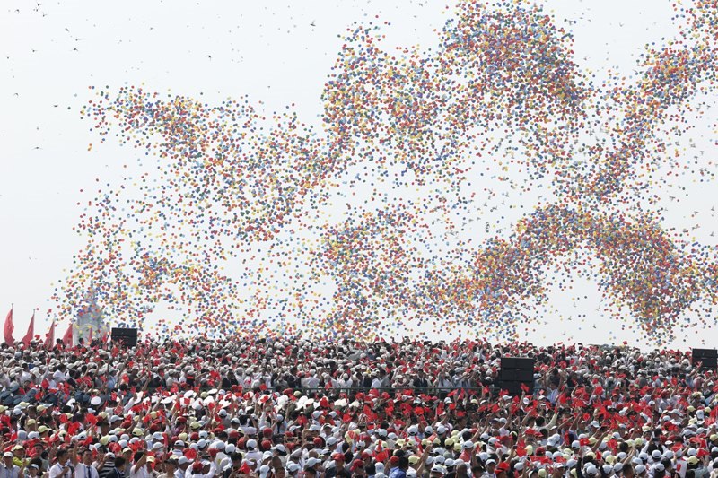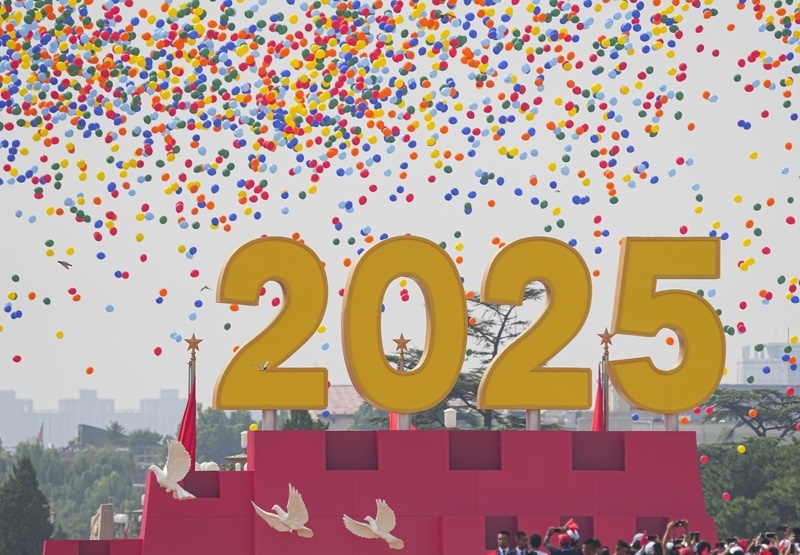 9月3日,紀(jì)念中國人民抗日戰(zhàn)爭暨世界反法西斯戰(zhàn)爭勝利80周年大會在北京隆重舉行。這是紀(jì)念大會現(xiàn)場放飛氣球。