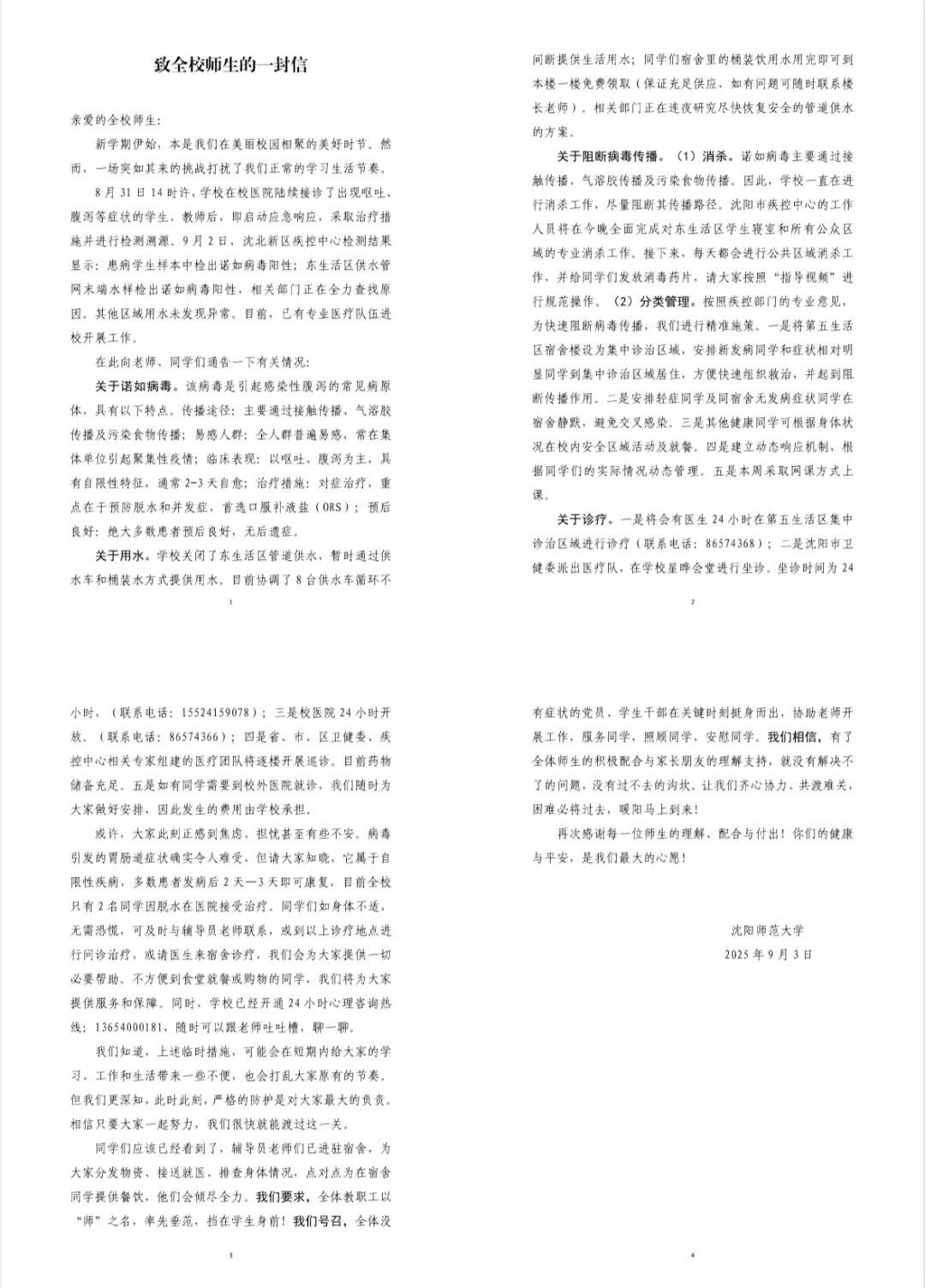 9月3日,沈陽師范大學(xué)發(fā)布的《致全校師生的一封信》(以下簡稱“《一封信》”)中稱,8月31日14時(shí)許,學(xué)校在校醫(yī)院陸續(xù)接診了出現(xiàn)嘔吐、腹瀉等癥狀的學(xué)生、教師。相關(guān)部門正在全力查找原因,目前已有專業(yè)醫(yī)療隊(duì)伍進(jìn)校開展工作。