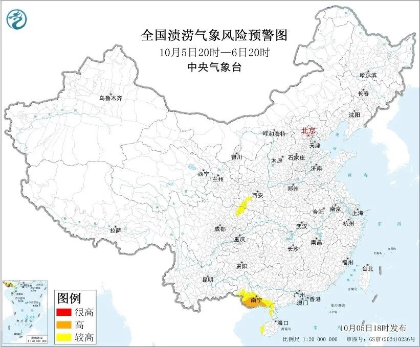 中央氣象臺10月5日18時發(fā)布漬澇風險氣象預(yù)報:受強降雨的影響,預(yù)計10月5日20時至6日20時,廣東西南部、廣西南部和西部、海南西部、四川東北部、陜西西部等地部分地區(qū)發(fā)生漬澇的氣象風險較高,其中,廣西南部等地部分地區(qū)發(fā)生漬澇的氣象風險高,易形成城市內(nèi)澇和農(nóng)田漬害,需加強防范。