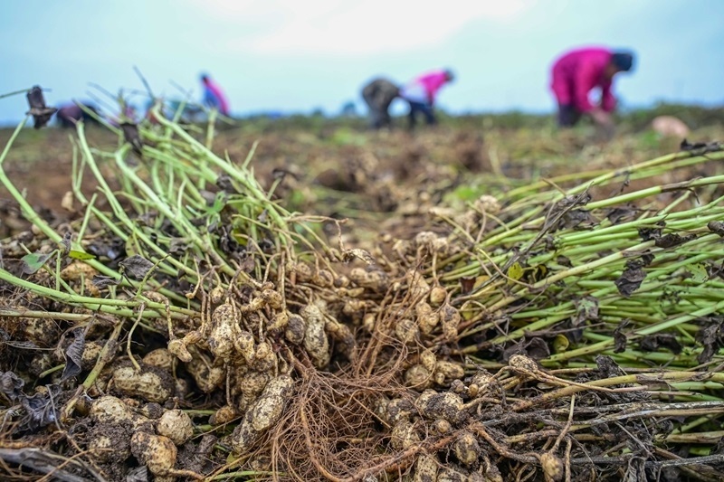 10月11日,河南省洛陽(yáng)市瀍河區(qū)白馬寺鎮(zhèn)翟泉村農(nóng)民在收獲花生。