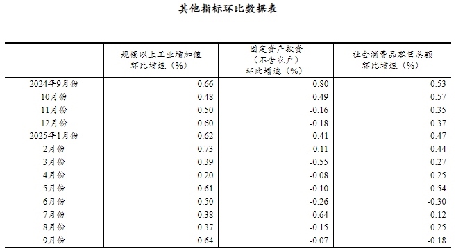 (2)根據(jù)季節(jié)調(diào)整模型自動(dòng)修正結(jié)果,對(duì)近一年來(lái)各期國(guó)內(nèi)生產(chǎn)總值、規(guī)模以上工業(yè)增加值、固定資產(chǎn)投資(不含農(nóng)戶(hù))、社會(huì)消費(fèi)品零售總額環(huán)比增速進(jìn)行修訂。修訂結(jié)果及2025年三季度GDP環(huán)比數(shù)據(jù)、2025年9月份其他指標(biāo)環(huán)比數(shù)據(jù)如下: