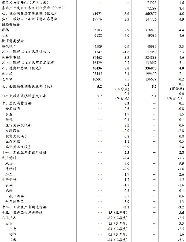 前三季度,全國(guó)固定資產(chǎn)投資(不含農(nóng)戶(hù))371535億元,同比下降0.5%;扣除房地產(chǎn)開(kāi)發(fā)投資,全國(guó)固定資產(chǎn)投資增長(zhǎng)3.0%。分領(lǐng)域看,基礎(chǔ)設(shè)施投資同比增長(zhǎng)1.1%,制造業(yè)投資增長(zhǎng)4.0%,房地產(chǎn)開(kāi)發(fā)投資下降13.9%。全國(guó)新建商品房銷(xiāo)售面積65835萬(wàn)平方米,同比下降5.5%;新建商品房銷(xiāo)售額63040億元,下降7.9%。分產(chǎn)業(yè)看,第一產(chǎn)業(yè)投資同比增長(zhǎng)4.6%,第二產(chǎn)業(yè)投資增長(zhǎng)6.3%,第三產(chǎn)業(yè)投資下降4.3%。民間投資同比下降3.1%;扣除房地產(chǎn)開(kāi)發(fā)投資,民間投資增長(zhǎng)2.1%。高技術(shù)產(chǎn)業(yè)中,信息服務(wù)業(yè),航空、航天器及設(shè)備制造業(yè),計(jì)算機(jī)及辦公設(shè)備制造業(yè)投資同比分別增長(zhǎng)33.1%、20.6%、7.4%。9月份,固定資產(chǎn)投資(不含農(nóng)戶(hù))環(huán)比下降0.07%。