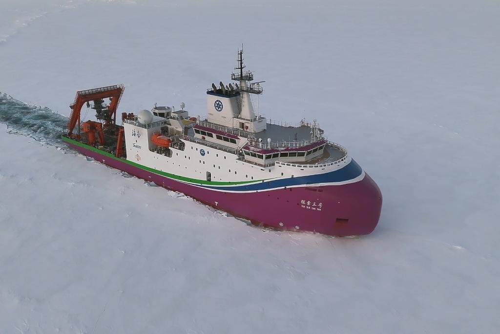 “探索三號(hào)”在北極密集冰區(qū)破冰航行。(自然資源部供圖)