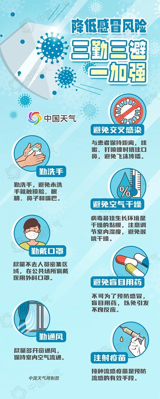中國天氣網(wǎng)提醒,秋冬時節(jié)冷空氣活躍,氣溫多起伏,感冒多發(fā)。良好的生活習慣有助于預(yù)防感冒,建議大家日常生活中均衡飲食、適量運動、保證充足睡眠,避免過度勞累。同時在流感高發(fā)時期外出盡量戴好口罩,注意勤消毒,還可通過注射疫苗降低流感風險。(文/江漪 設(shè)計/王維一 數(shù)據(jù)支持/董靜舒 李寧 審核/祁保剛 劉紅欣 張慧 劉文靜 余曉芬)