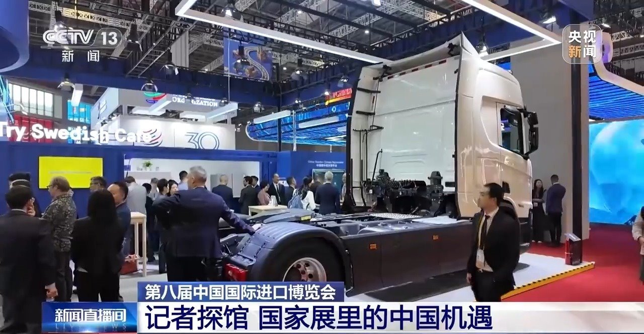 我的AI眼鏡第一時(shí)間就捕捉到了這個(gè)“大塊頭”,放眼望去,整個(gè)國(guó)家展里沒有比它還大件的展品了。這輛高端重卡車型來自瑞典,是享有“公路之王”美譽(yù)的瑞典企業(yè)斯堪尼亞帶來的重型運(yùn)輸領(lǐng)域的最新成果。別看它塊頭大,新技術(shù)賦予了它高效節(jié)能的特點(diǎn),是今年國(guó)家展里最吸睛的展品之一。
