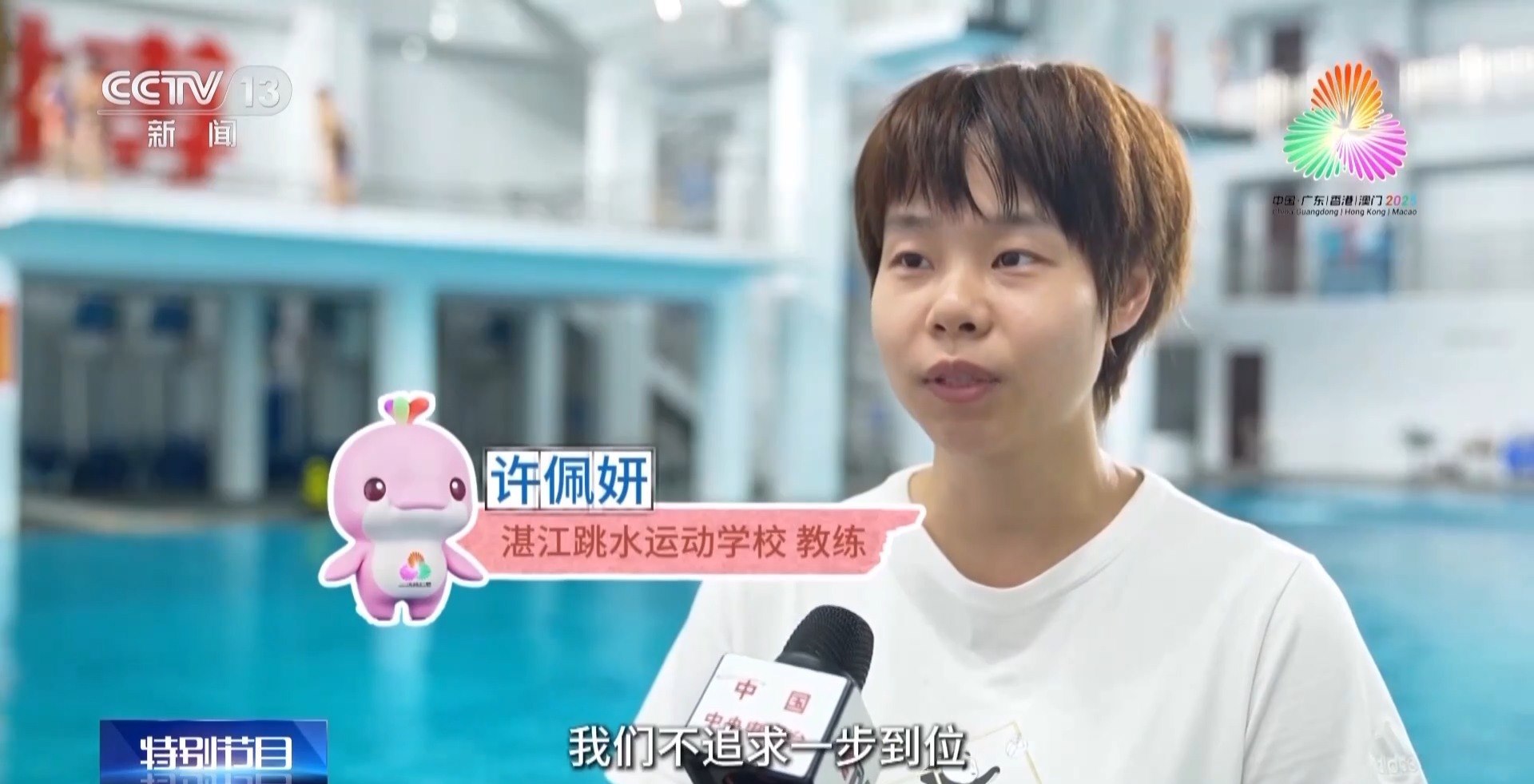 湛江跳水運(yùn)動學(xué)校教練 許佩妍:我們不追求一步到位,因?yàn)槲覀兒芏嗪⒆佣际呛_呴L大的,喜歡追波逐浪,那么他們來了以后,我們先讓他們愛上水,愛上跳躍,正是這份興趣成為他們成長最大的基礎(chǔ)。